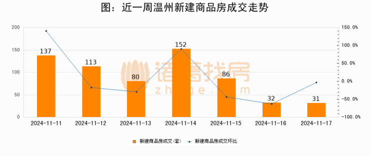 根据温州市住房和城乡建设局数据显示,2024年11月17日温州新建商品房成交31套,较昨日减少1套,环比下降3.1%