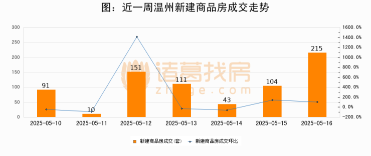 根据温州市住房和城乡建设局数据显示,2025年05月16日温州新建商品房成交215套,较昨日增加111套,环比上涨106.7%