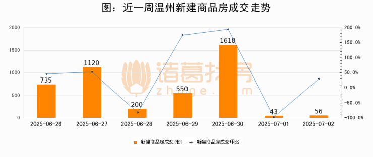 根据温州市住房和城乡建设局数据显示,2025年07月02日温州新建商品房成交56套,较昨日增加13套,环比上涨30.2%。近一周温州新建商品房日均成交618套。07月02日单日成交56套,低于近一周平均水平90.9%。