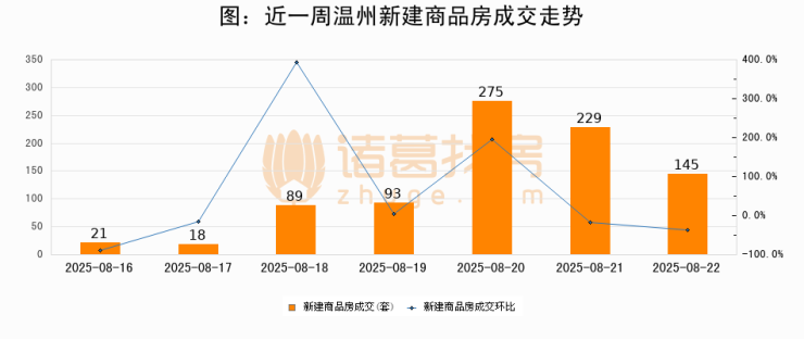 根据温州市住房和城乡建设局数据显示,2025年08月22日温州新建商品房成交145套,较昨日减少84套,环比下降36.7%。近一周温州新建商品房日均成交125套。08月22日单日成交145套,高于近一周平均水平16%。