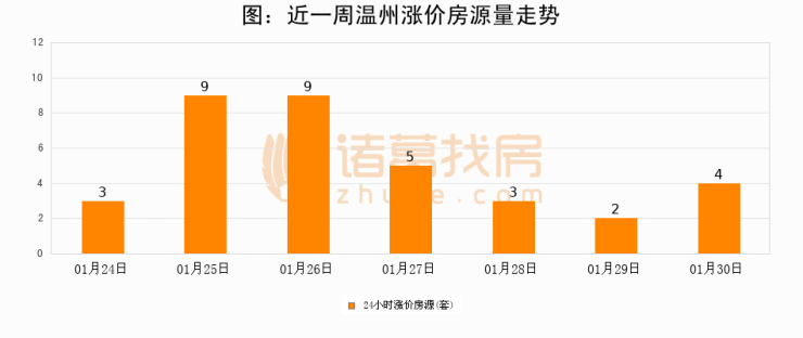 根据诸葛找房数据显示,温州24小时涨价房源量为4套,较01月29日增加2套,环比上涨100%。与此同时,涨价房源占比小幅扩大,业主信心有所提升。