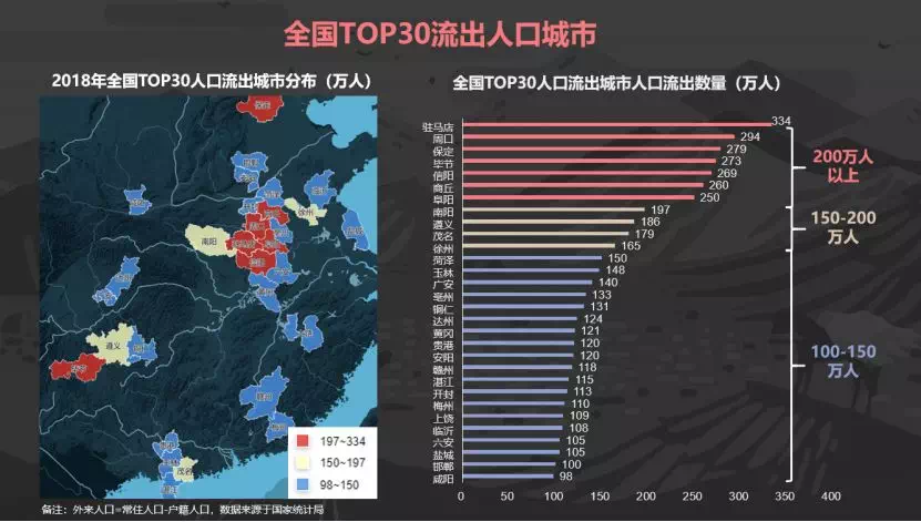 说完了大中城市要如何投资,下面从人口红利的角度,谈谈一些中小城市的投资方法。先从一个有趣的现象说起,全国TOP30人口流出城市,基本都有超过100万以上的人口流出。