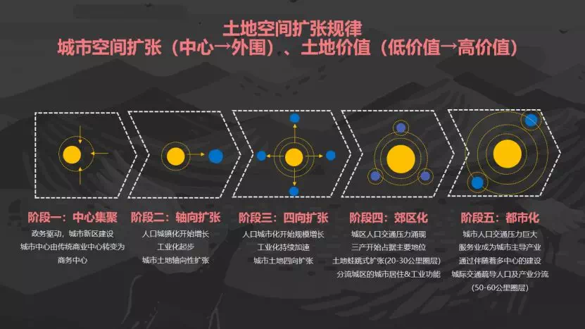 城市的空间扩张类似人从小到大的生长,从城市中心到城市外围趋势扩张的同时,土地价值会产生从低到高的变化趋势,分别是中心集聚、轴向扩张、思想扩张、郊区化、都市化五个阶段。