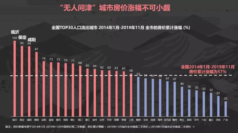 划重点,然而就是这些“无人问津”的小城市,在2014年1月-2019年11月,有一半以上的房价累计涨幅超过全国的平均水平,达到57%,同时临沂、保定、咸阳等城市涨幅均超过90%。