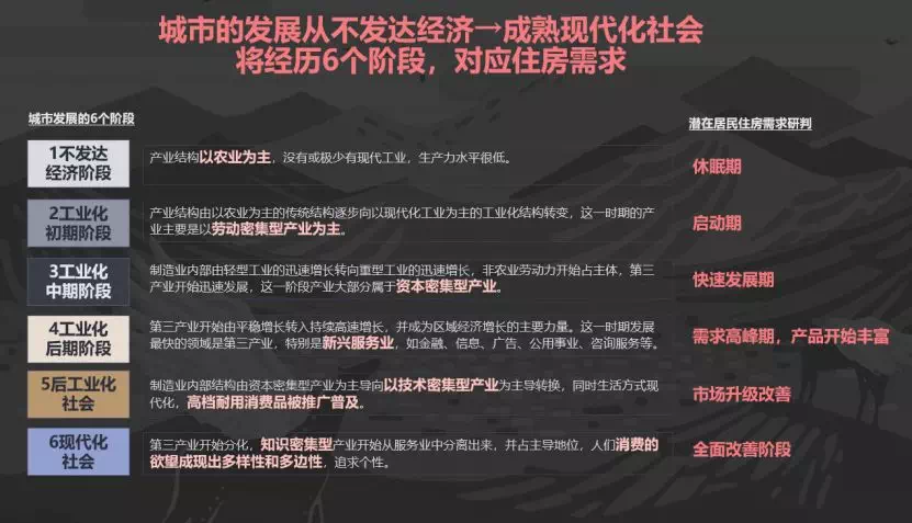 城市的发展一般从不发达到成熟现代社会,禾略对应城市发展的6个阶段,对应潜在居民住房需求做出研判,如图: