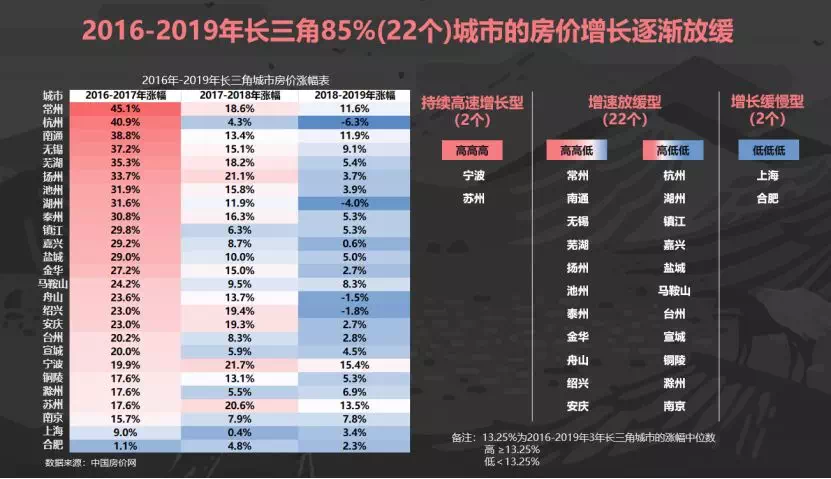 以长三角城市群为例,2016-2019年,26个城市中有85%(22个)城市房价的增长呈现逐渐放缓的现象,意味着对于不同区域的城市来说,内部城市也存在房价轮动规律。