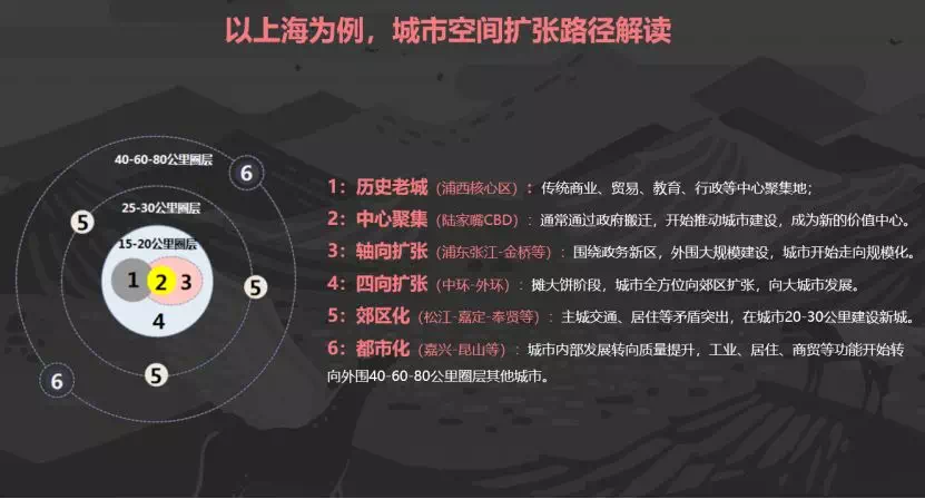 5-6阶段:城市开始向30-60公里圈层扩张,中心城区价值逐渐突显。