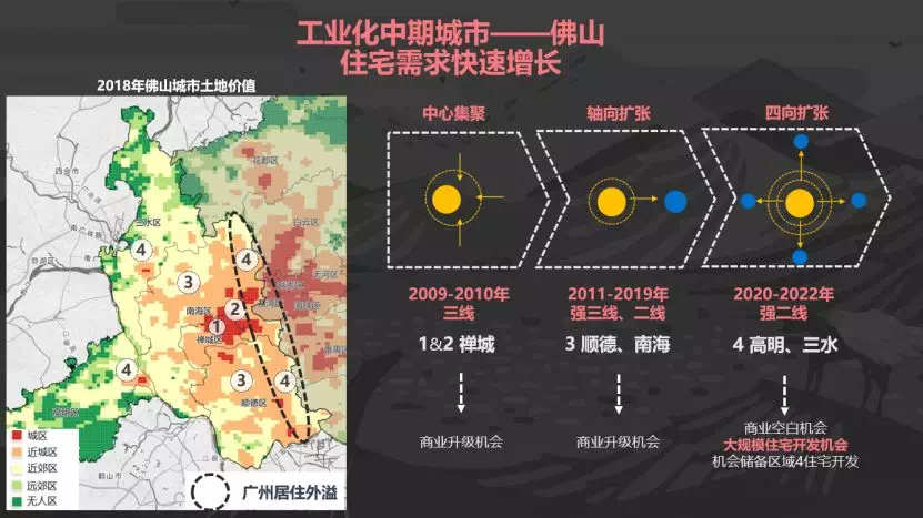 空间扩张规律:2011-2019年轴向扩张(南海→禅城→顺德),2020年开始进入四向扩张(摊大饼)阶段,④区域值得关注。