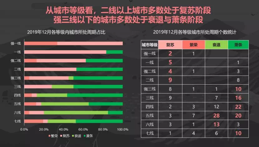 从城市等级来看,强三线以下的城市多数处于衰退与萧条的阶段,而二线以上的城市多数处于复苏阶段。
