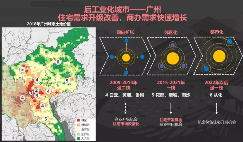 2009-2014年四向扩张——④区域:土地价值基本为近城区以上,番禺白云部分区域土地价值达到城区,面临商业升级+住宅市场改善化的机会。