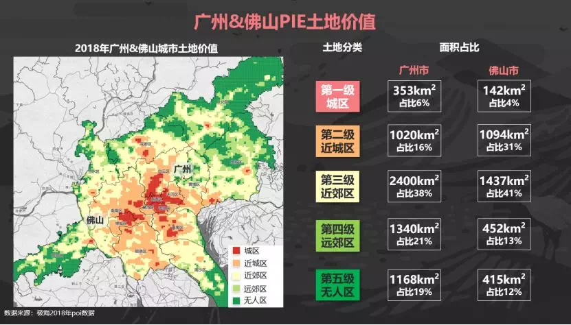 以广佛2018年土地价值为例,主要分为五类:城区、近城区、近郊区、远郊区、无人区。