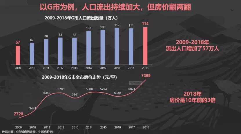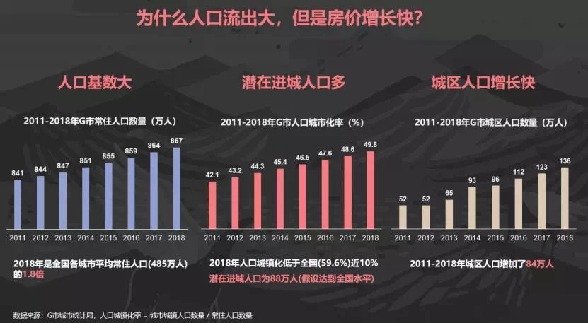带着这个问题,以G市为例为大家解答,G市人口流出持续加大,但是房价翻两翻。原因在于G市的人口红利非常大:人口基数大、潜在进城人口多、城区人口增长快,快到潜在进城购房人群的购买力压到流出人群的购买力。