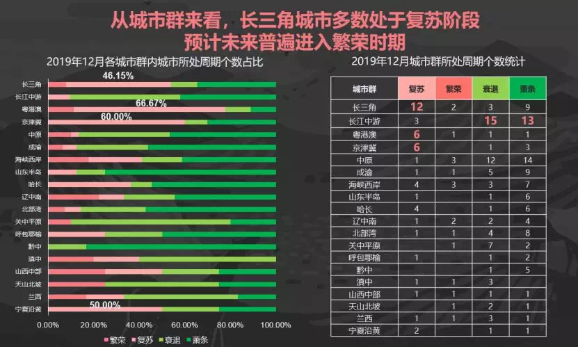 从城市群来看,目前长江中游城市群,大多数处于衰退以及萧条的阶段;反观长三角、粤港澳以及京津冀城市群的大多数城市则处于复苏阶段,预计未来的市场信心将持续走高。