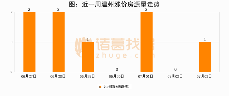 根据诸葛找房数据显示,温州24小时涨价房源量为1套,较07月02日增加1套,环比上涨0%。与此同时,涨价房源占比小幅扩大,业主信心有所提升。