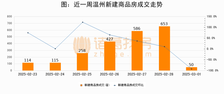 根据温州市住房和城乡建设局数据显示,2025年03月01日温州新建商品房成交50套,较昨日减少603套,环比下降92.3%