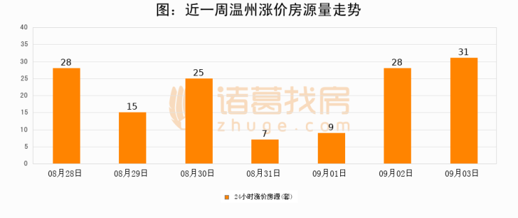 根据诸葛找房数据显示,温州24小时涨价房源量为31套,较09月02日增加3套,环比上涨10.7%。与此同时,涨价房源占比小幅扩大,业主信心有所提升。