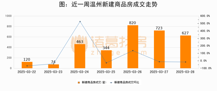 根据温州市住房和城乡建设局数据显示,2025年03月28日温州新建商品房成交627套,较昨日减少96套,环比下降13.3%