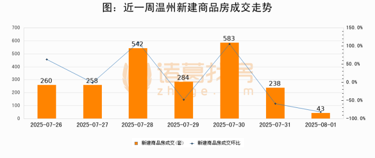 根据温州市住房和城乡建设局数据显示,2025年08月01日温州新建商品房成交43套,较昨日减少195套,环比下降81.9%