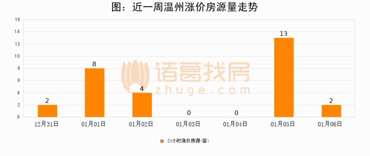 根据诸葛找房数据显示,温州24小时涨价房源量为2套,较01月05日减少11套,环比下降84.6%。与此同时,涨价房源占比小幅回落,对于购房者来说是一个入市窗口期,购房者可抓住时机入市。